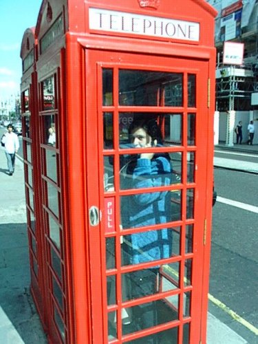 Andrea in a traditional English red phone box somewhere near Covent Garden.