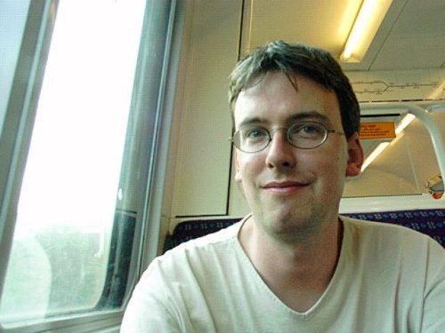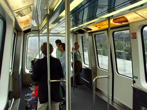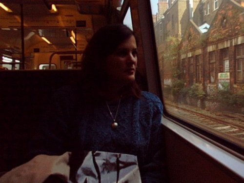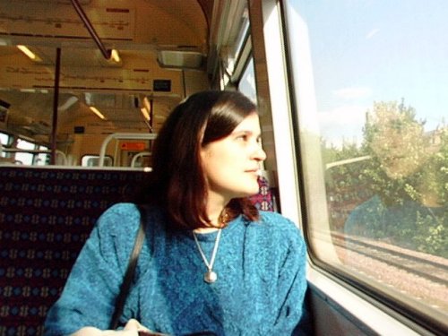 Andrea on the tube train (Waterloo Line) heading North somewhere past Finchley Road.