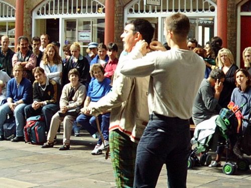 A combined Juggling and Escapologist act in Covent Garden, London, UK.